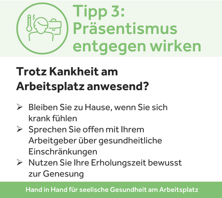 Präsentismus – das Arbeiten trotz Krankheit oder Erschöpfung – kann langfristig schaden. Nehmen Sie sich die Zeit, die Ihr Körper und Geist brauchen, um sich zu regenerieren. Pausen sind keine Schwäche, sondern essenziell für Ihre Gesundheit.
