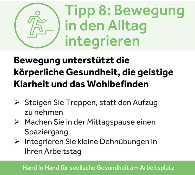Schon kleine Bewegungseinheiten, wie ein Spaziergang in der Mittagspause oder kurze Dehnübungen, helfen, Stress abzubauen und die geistige Frische zu bewahren. Bewegung ist eine einfache und wirksame Methode, das Wohlbefinden zu steigern.