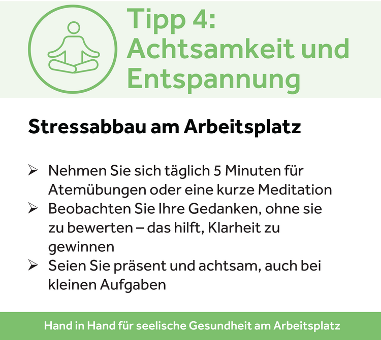 - Unser Tipp: Nehmen Sie sich täglich fünf Minuten für eine Atemübung oder eine kurze Achtsamkeitspause.