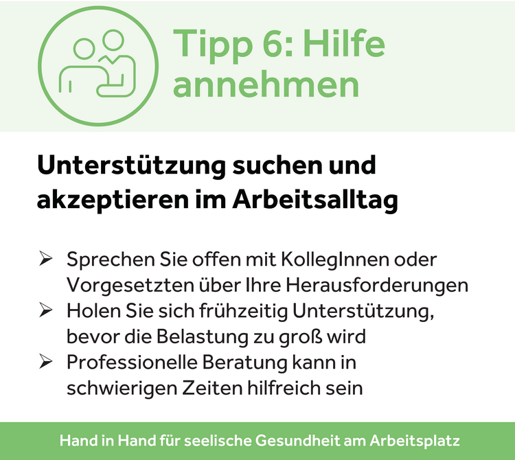 Sich Unterstützung zu holen, ist kein Zeichen von Schwäche, sondern von Stärke. Ob durch Gespräche mit KollegInnen, Vorgesetzten oder professionellen BeraterInnen – es ist wichtig, Hilfe anzunehmen, wenn die Belastung zu groß wird.
